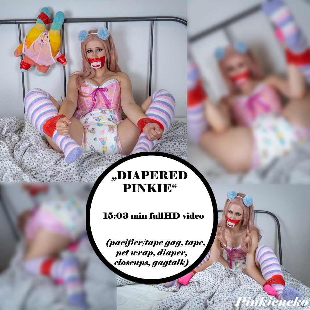 Pinkie is punching her plushie and showing off bratty behavior. It is not acceptable at all, it is time to teach her a lesson. She is forced to wear diaper and taped up with red tape, gagged with tape over pacifier and her hands are wrapped with pet wrap.